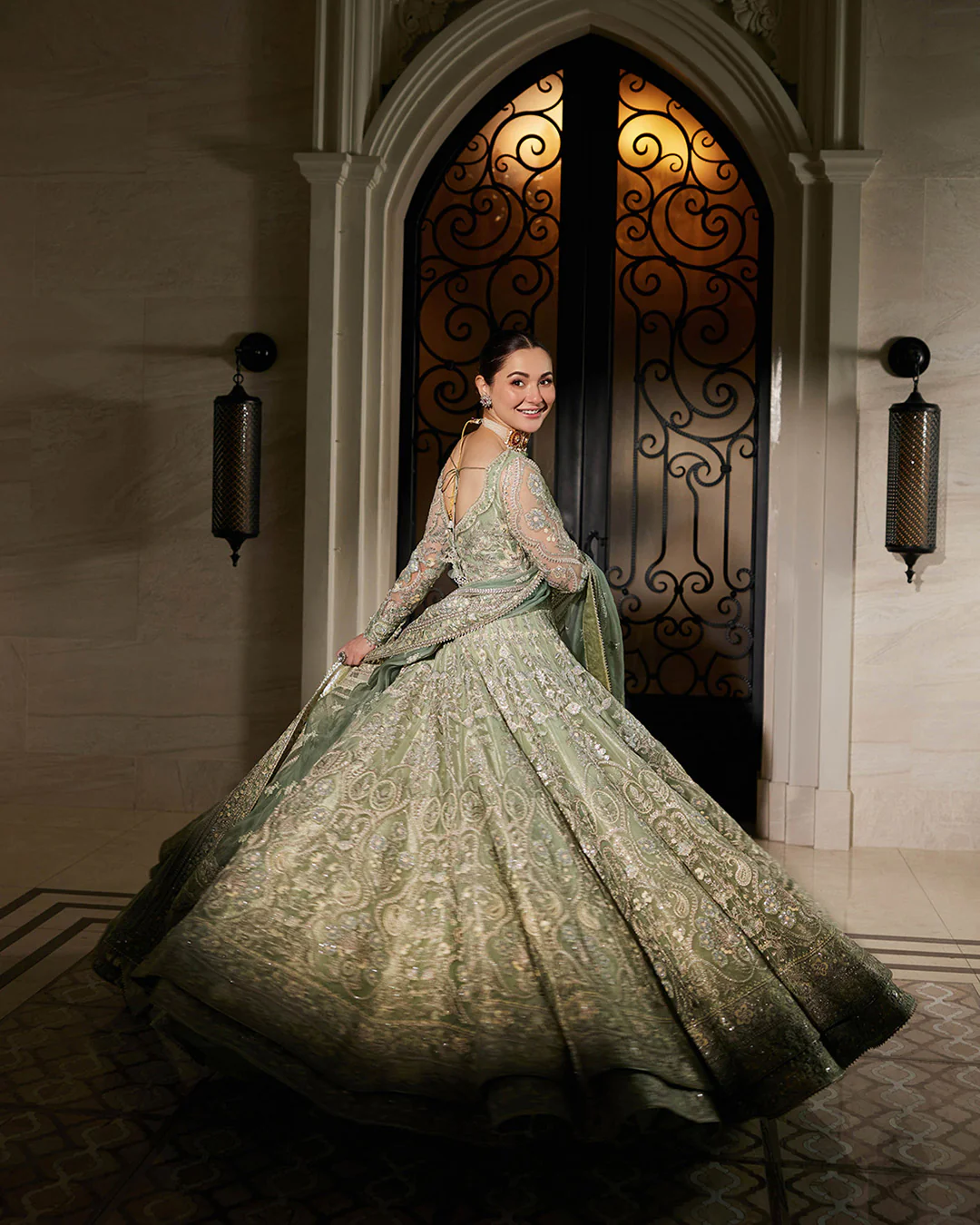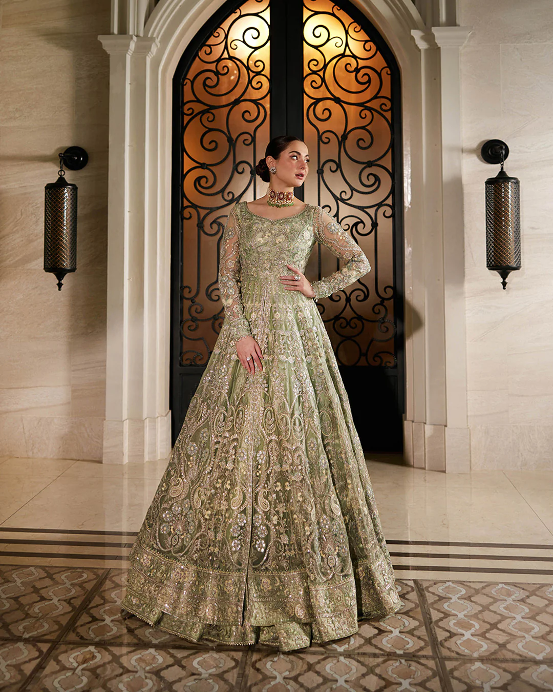 Exhibiting exceptional craftsmanship, Jemina radiates finesse in every drape. Crafted on ivory gold net, the lehenga and choli feature a unique fusion of resham, sequins and tilla, harmonised seamlessly in densely packed motifs. This set is complemented by a diaphanous net dupatta that showcases exquisitely embroidered motifs, truly making it a one-of-a-kind piece, perfect for all your festivities.