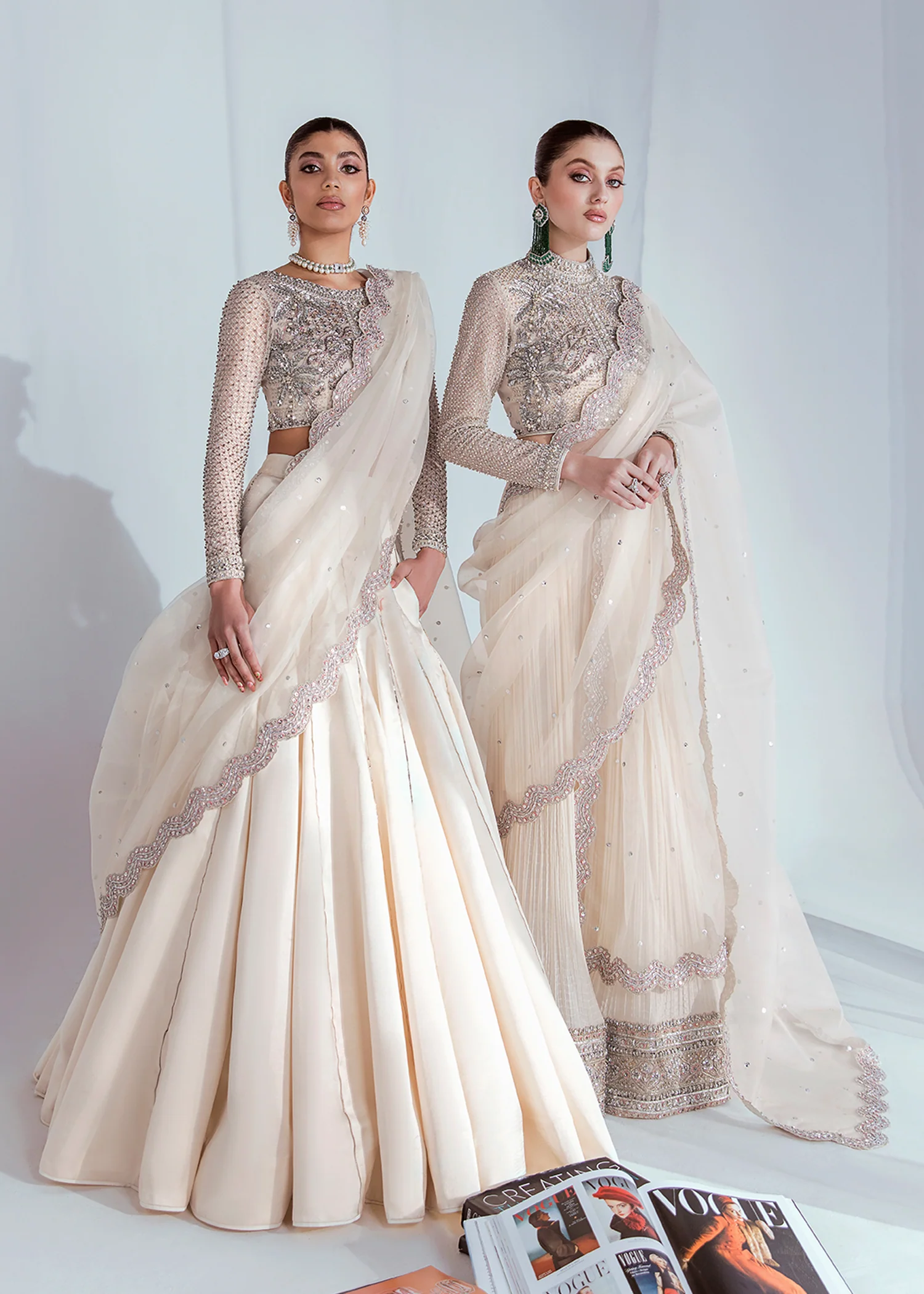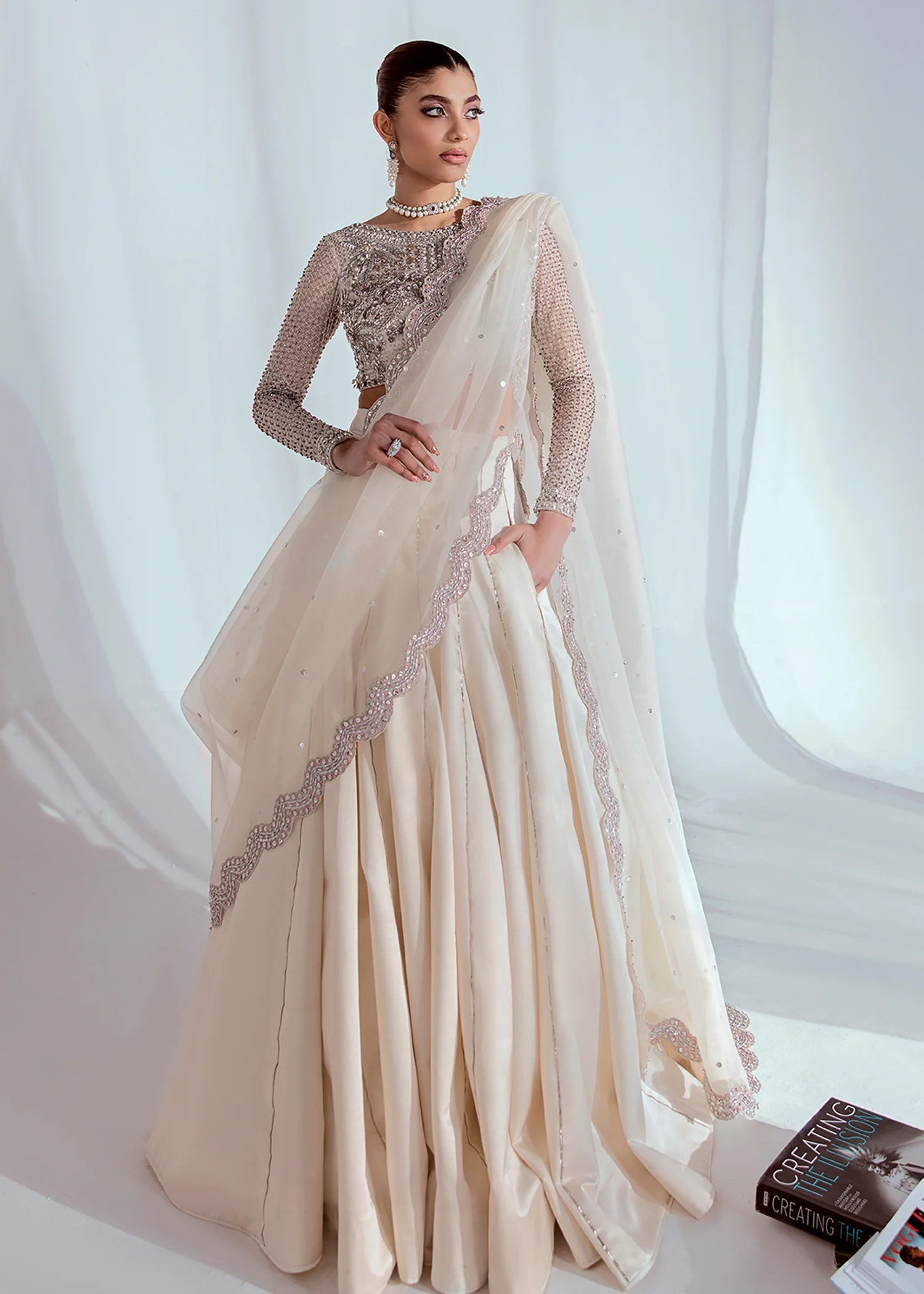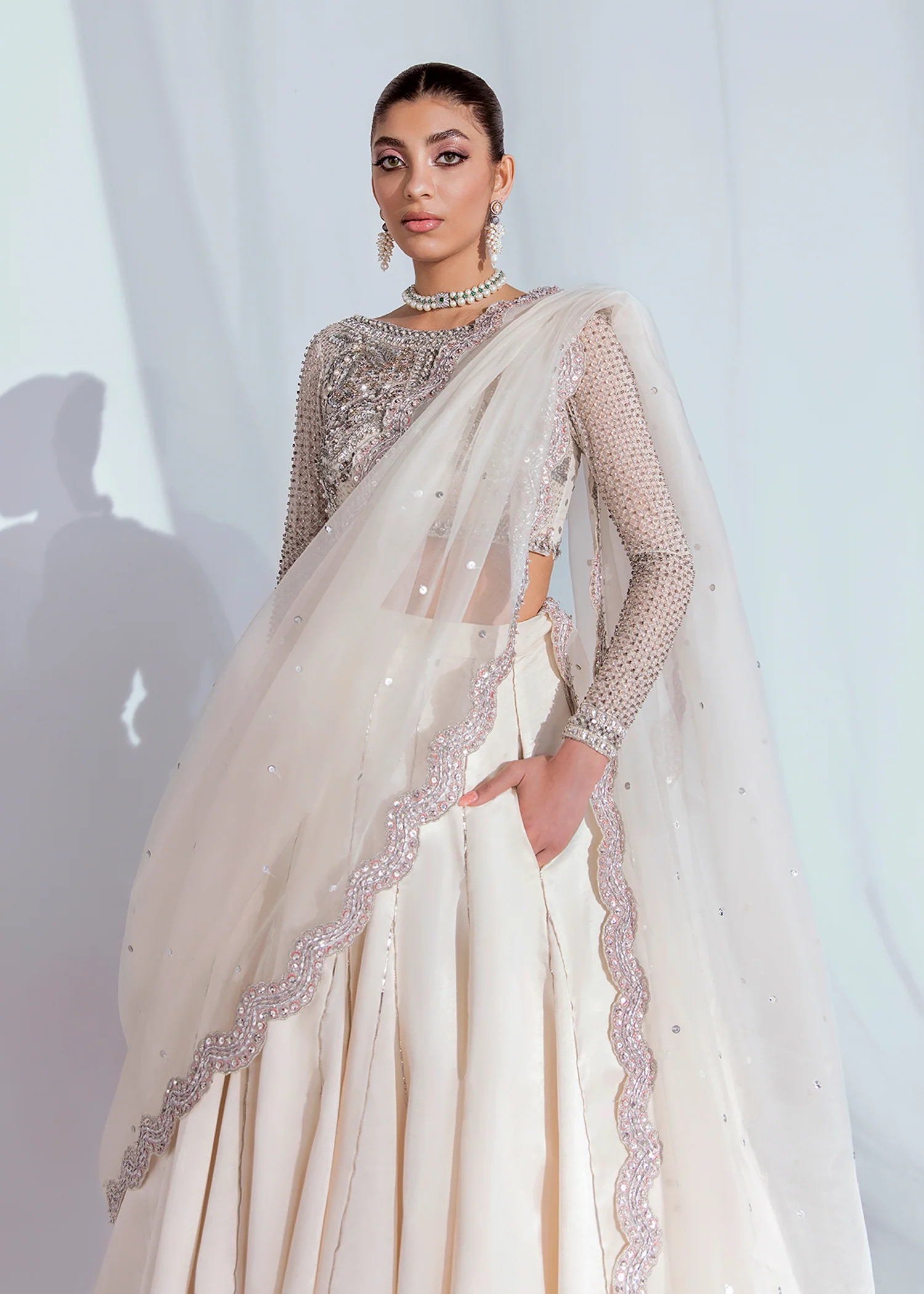 This set comes with an organza choli delicately embellished with silver sequins, pipe, and Swarovski, incorporating patent Hussain Rehar’s palm tree motif along with boat neckline. White satin lehnga with silver details. Paired with beautifully scalloped dupatta with all over spray.