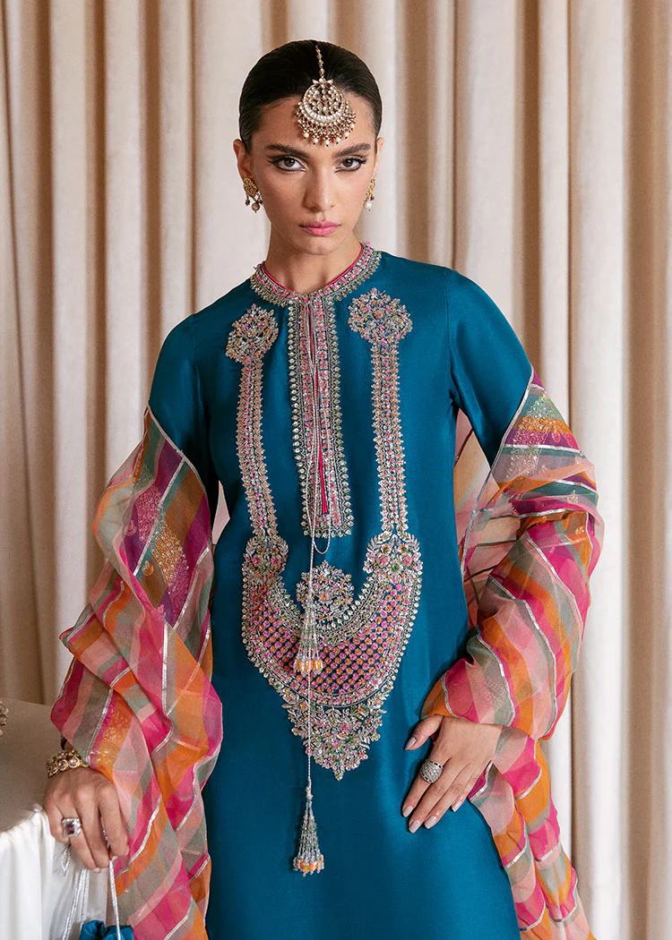 A stunning teal blue raw silk long shirt with tassels and beautiful embellishments in the front of the shirt and on the sleeves. The embellishments include delicate work of nakshi, dabka, sitara and cutdana in the hues of pink, orange, dark green, olive green, silver and iceblue. It comes along with a culotte pant which has pockets on the sides and a fine border of sequins and thread in pink and orange. The outfit consists of a flowy chatta patti organza dupatta in multicolor and gotta finishing