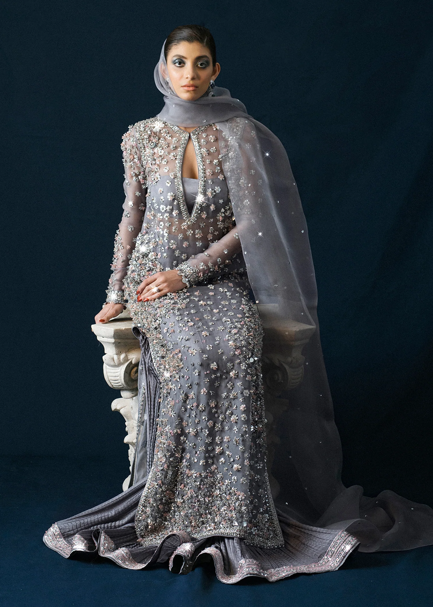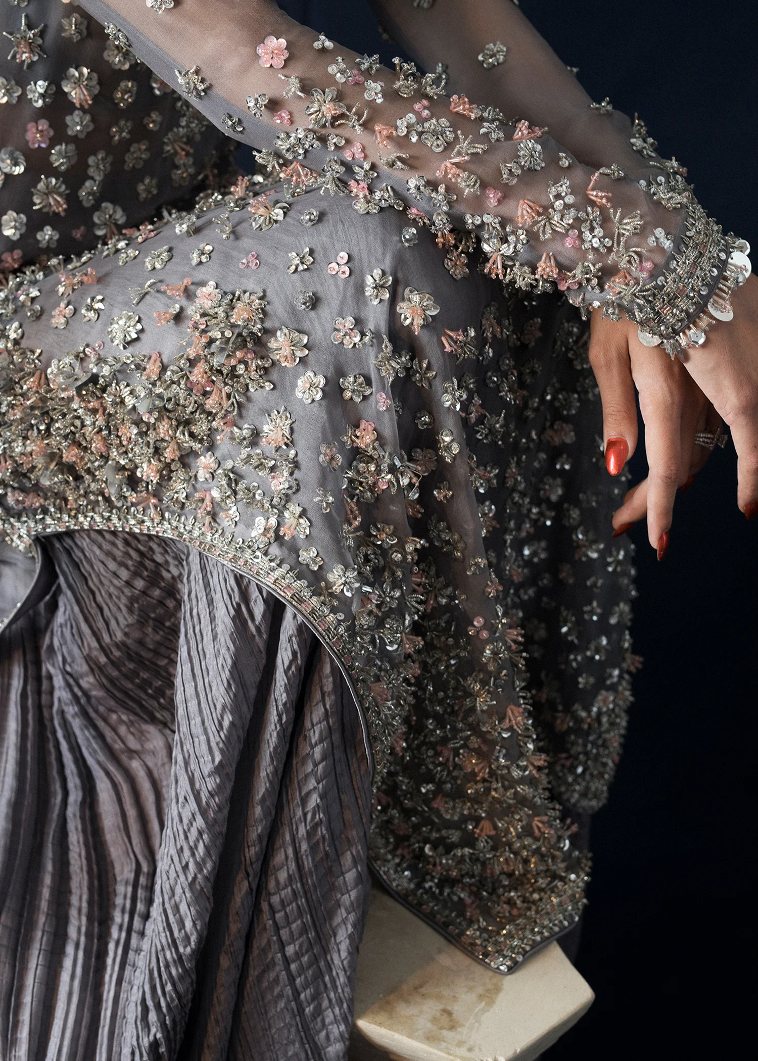 This grey epitome of grace is completely hand embellished. Featuring a key-hole neckline. Three-dimensional floral embellishments donned with silver pipes, sequin, stones tastefully blended with grey and pink sequin and stone work. Paired with crushed silk sharara with embellished borders. Completing the look with sequin sprayed organza dupatta.