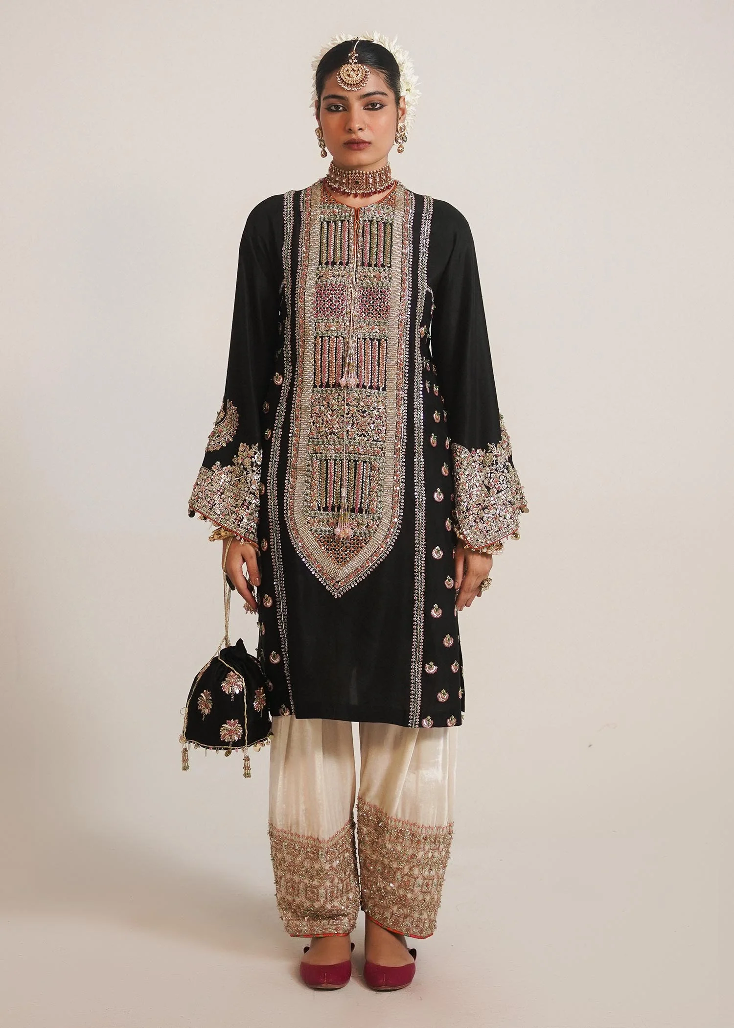 A magnificent black raw silk shirt heavily embroidered and embellished with the tinge of pink and orange cutdana, gold naqshi and dabka on neckline and boti details embellished with pink and green cutdana on side panels on front adds to the simple yet classy vibe. It comes with velvet shalwar with heavy embellishment on the border and 4 yards plain organza dupatta.